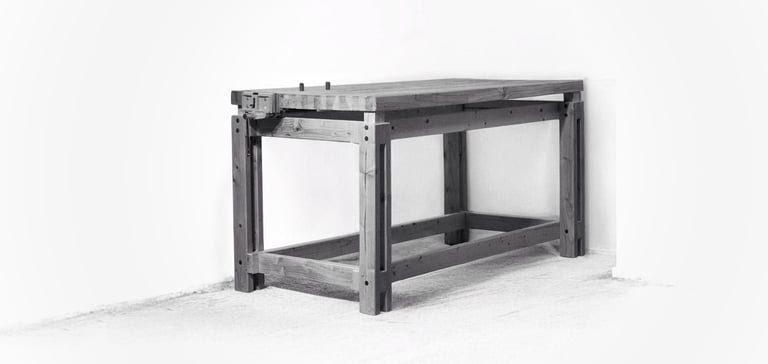 Rooted in tradition and built for the present, this bench draws from the quiet strength of Japanese woodcraft. Comprised entirely of Douglas Fir, from the trestle frame to the soft top, Workbench No. 4 invites renewal, forgiveness, and durability. The black ceramic hardware adds a modern element. The bench has one row of 3/4'' dog holes, working from the front vise and slotted legs that offer ample clamping options. Made in the USA, Workbench No. 4 (Yasubee) is designed to adorn maker spaces for a lifetime of use.